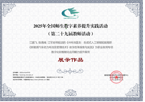 (通讯员 高燕)在刚刚结束的2025年全国师生数字素养提升实践活动职业教育专项评选活动中,我校报送的案例成功入选“职业教育数字化和智能化应用能力提升案例展示作品”。此次活动图文信息中心积极组织,共征集3个案例,其中江鹏飞、陈高峰、江军三位教师共同完成的《AI电池医生:生成式人工智能赋能高职〈新能源汽车动力电池及管理技术〉教学改革探索与实践》获评为展示作品。这一成果不仅是对我校一线教师数字化教学创新能力的权威认可,更是学校深入贯彻国家教育数字化战略、推动“数智融合”在职业教育领域落地生根的生动实践。